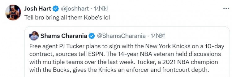 尼克斯球员哈特调侃道:“告诉兄弟,把他的所有科比鞋都带来。”