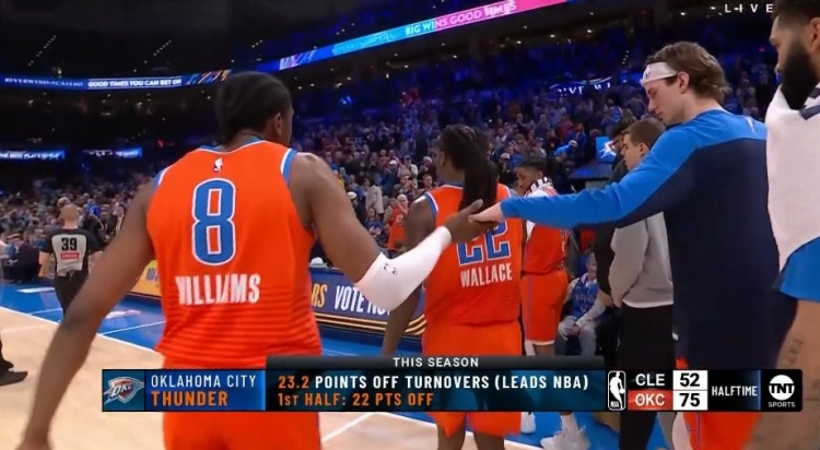 雷霆本赛季利用对手失误拿到23.2分联盟第一 今天上半场就22分