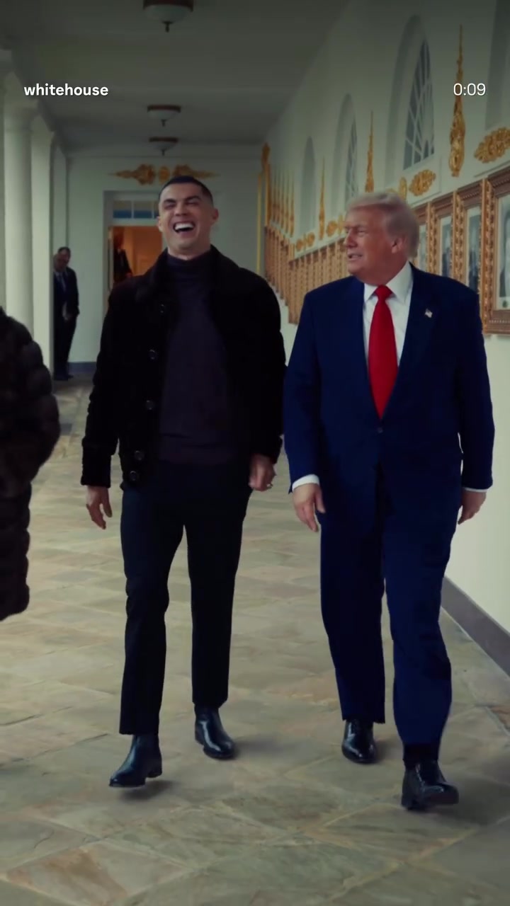 11月19日讯 白宫官方刚刚发布社媒,晒出了一段C罗与美国总统特朗普一同在走廊散步的片段,并且配文:“Two GOATS,CR7 x 45/47????”。